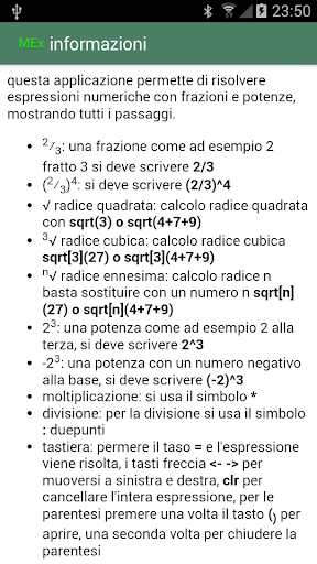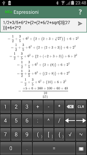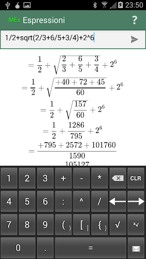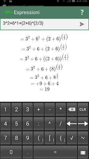 application that allows to solve numeric expressions with fractions and powers, after writing the expression if you press the "equal" will be 'resolved expression with all the steps.