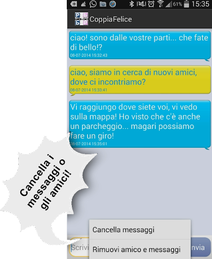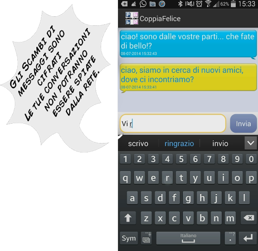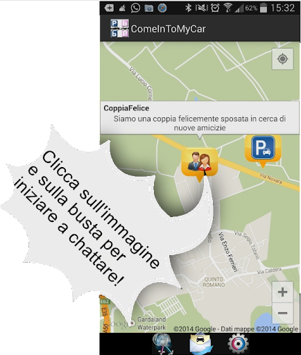 Nessuna registrazione è necessaria: basta inserire un alias, chi sei e chi cerchi e sarai subito in contatto con gli altri. Sulla mappa, semplici icone mostreranno le persone più vicine a te, con le quali potrai cominciare a chattare semplicemente premendo sulla nuvoletta (tutti i messaggi sono cifrati e nessuno potrà spiarti). Inoltre verranno mostrati alcuni dei luoghi di ritrovo più popolari nella tua zona.