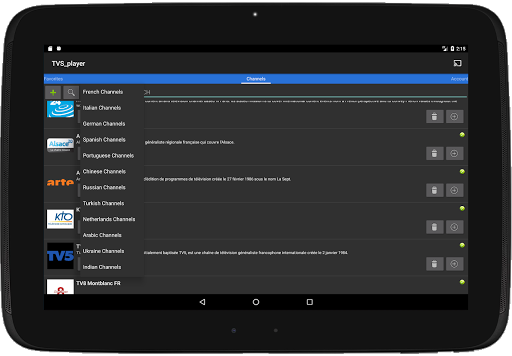 TVS_player is an IPTV player easy to use: from the channel tab, you can select from a menu list, the preferred country and after you can easily watch one of the channel by clicking the button play associated. The channel with the selected link can be added to favorite tab.
