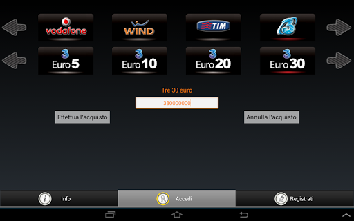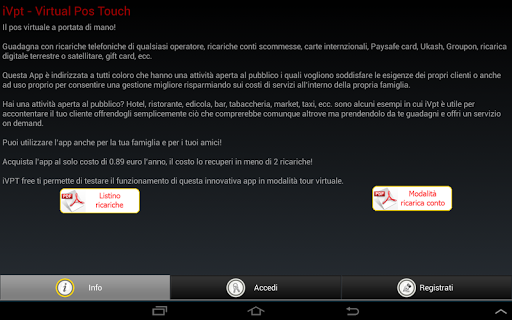 Questa è versione Free solo a scopo dimostrativo. Guadagna vendendo BITCOIN e ALTCOIN, ricariche telefoniche di qualsiasi operatore (Tim, Wind, Vodafone, Tre e PosteMobile), ricariche conti scommesse (Pokerstarts, BWin, William Hill, Gioco Digitale), carte internazionali, carte servizi, Paysafe card, Ukash, ricarica digitale terrestre o satellitare (Premium, Sky). Questa App è indirizzata a tutti coloro che hanno una attività aperta al pubblico i quali vogliono soddisfare le esigenze dei propri clienti. Hai una attività aperta al pubblico? Hotel, ristorante, edicola, bar, market, taxi, ecc. sono alcuni esempi in cui iVpt è utile per accontentare il tuo cliente offrendogli semplicemente ciò che comprerebbe comunque altrove ma prendendolo da te guadagni e offri un servizio on demand.