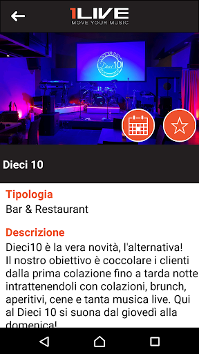 Vai nella GUIDA LOCALI, scrivi il nome del locale per individuarlo e mettilo quindi tra i tuoi preferiti. Cliccando sull’icona del calendario potrai tenere sotto controllo tutti i suoi eventi musicali in programma e salvarli nel tuo smartphone.