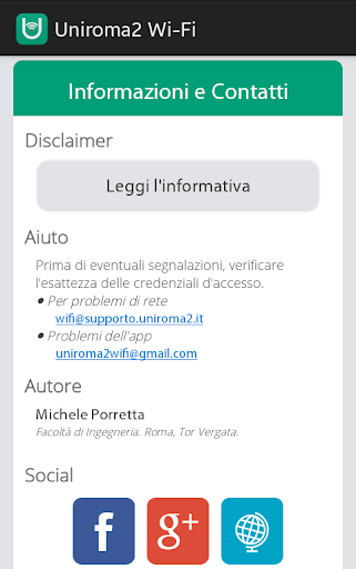 L'applicazione è da poco stata pubblicata ed è ancora sotto studio per correggere eventuali imperfezioni ed errori, nonché per espanderne le funzionalità. Per errato funzionamento e/o imperfezioni grafiche, oltre che a consigli e migliorie, si prega di informare lo sviluppatore tramite mail a: uniroma2wifi@gmail.com oppure sfruttando lo spazio Social dell'app.