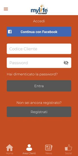 Se sei un cliente My Life già registrato all'area clienti online, utilizza il tuo codice cliente e la tua password per accedere anche all’applicazione.
