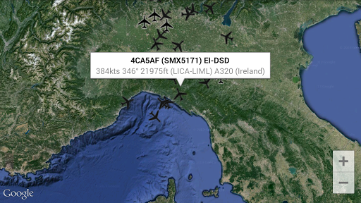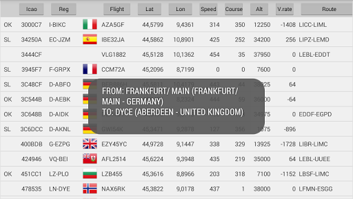 This App shows real time planes list with lot of infos (icao callsign, registration, flight number, geographical position, speed, altitude, course, vertical rate, type, country, route, operator, squawk etc., based on data transmitted by plane ADS-B transponder and received by your Mode-S receiver) with country flags and plane sihlouettes or operator logo.