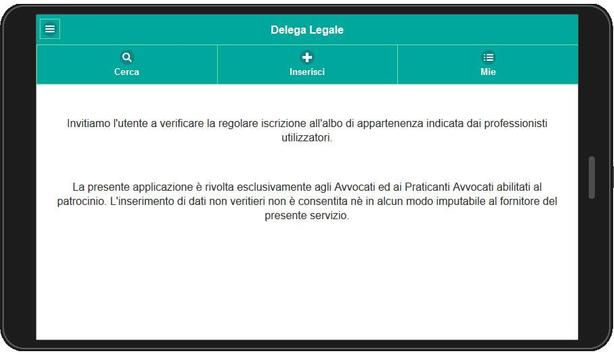 Delega Legale è un’app di carattere esclusivamente professionale, ovvero accessibile ai soli avvocati o praticanti avvocati iscritti ai propri ordini di appartenenza. La registrazione prevede l’inserimento del tesserino rilasciato dal Consiglio dell’Ordine, l’indirizzo PEC (posta elettronica certificata) e il numero di cellulare per una immediata reperibilità. L’accesso all’applicazione prevede la scelta tra la ricerca e l’inserimento relativa alla disponibilità in relazione ad una delega.