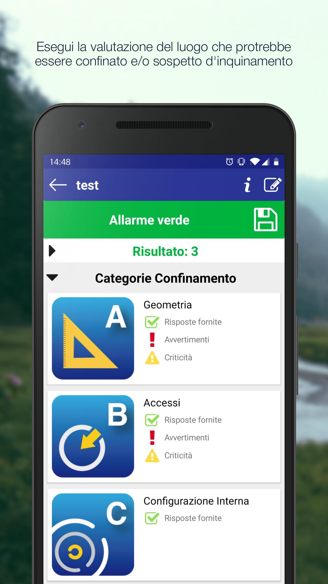 Per ciascuna categoria vengono sottoposte all’utente diverse domande per identificare le caratteristiche del luogo. Il risultato finale è un valore numerico, frutto di un algoritmo di calcolo basato sulle diverse risposte dell’utente, che identifica la possibilità di trovarsi o meno in presenza di ambiente confinato e/o sospetto d’inquinamento.