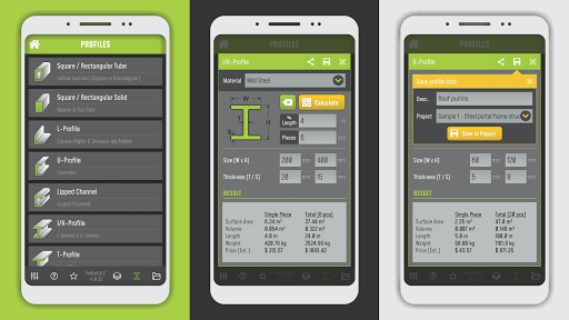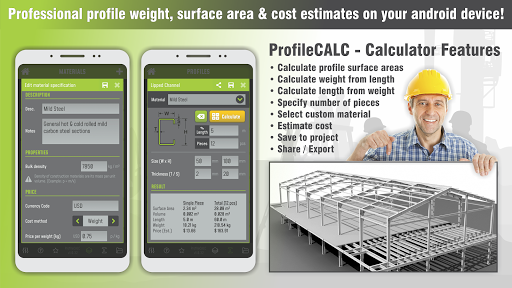 ProfileCALC is a professional, easy-to-use profile weight, surface area & cost estimation system designed for use by engineers, contractors, structure designers, quantity surveyors. The app allows you to quickly create estimations, calculations & reports for steel or wood frame structures. It can also be used to calculate the materials for roof trusses, portal frames, columns, beams, gates, fences, carports, balustrades and lots more!