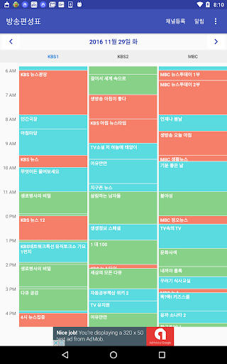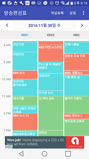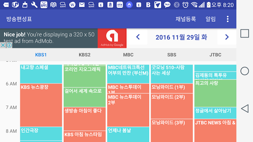 लाइव प्रसारण लाल रंग में दिखाए जाते हैं, पुनर्वितरण हरे और नियमित प्रसारण फ़िरोज़ा में दिखाए जाते हैं।