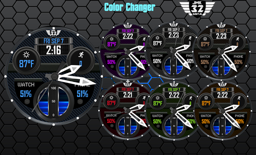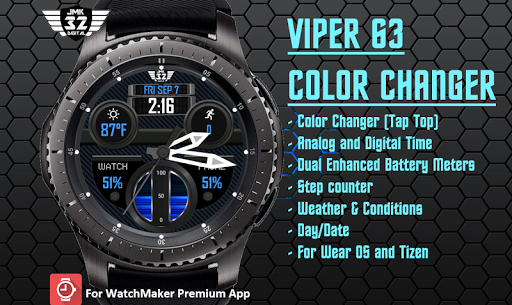 This VIPER 63 color changer watchface is an interactive, distinct, stylish, multi-informational watchface for Android Wear and Tizen watches with all pertinent info at a glance: