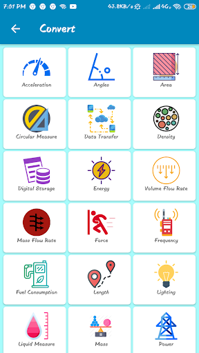 14. Unit Converter - Convert between different units Such as Acceleration, Angles, Area, Data transfer, Density, Digital storage, Energy, Flow rate, Force, Frequency, Fuel Consumption, Length, Lighting, Mass, Torque, Temperature, Time, Velocity, Volume.