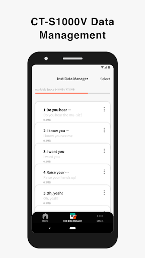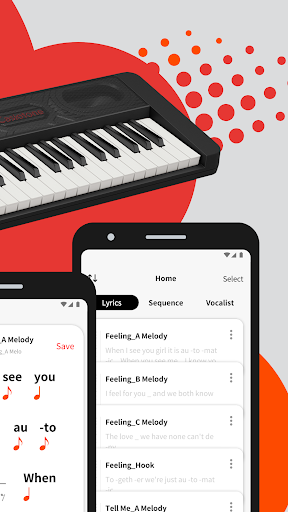Once the Lyric Creator app is installed on your smartphone or tablet, you can start transferring lyrics, sequences, vocal samples, etc., by connecting your device to your CT-S1000V via a USB cable. While connected, you can also use the app to view how much space is available on the CT-S1000V’s internal drive, delete files, and edit file names. Program files are exported using a proprietary format that enables sharing between CT-S1000V users. You can also import Music XML lyric data and note values from your DAW.
