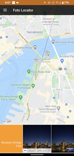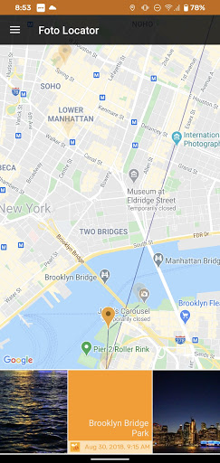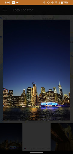 This app shows your local or SNS photos, with time and location data if available. This app may also show estimated photo location based on check-in data in your Swarm (former Foursquare) account. If you take photo and check-in at similar time, probably you take photo near place from the check-in.