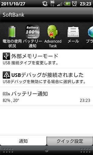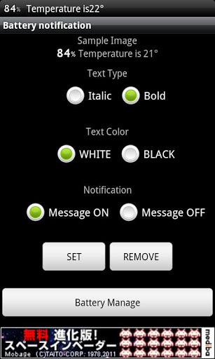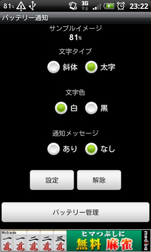 The battery can be confirmed at AN time on the left of the screen.It is an application program to be able to see the state of the battery in the statusbar.move in 1 jump.Setting1. Text Typequot;Italicquot; or quot;Boldquot;2 Text Colorquot;Whitequot; or quot;Blackquot;3 Notification Message quot;ONquot; or quot;OFFquot; If you set quot;Notification Messagequot; is ON.The message is notified when the state of the battery is changed.