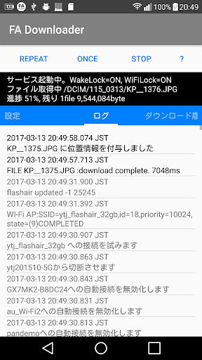 - FlashAir には無線LANタイムアウトが存在します。無通信状態が続くと無線LAN機能を停止してしまいます。デフォルトは300秒です。アプリから自動転送を行う場合は更新間隔を300秒より短くするか、もしくはFlashAir側の無線LANタイムアウトの設定を変更してください。