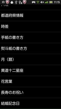 手帳によくある付録をあつめました。また、APOSTA SMART、APOSTA SMART FREEがあれば、相互の起動が楽に行えるようになっています。 収録内容 ・年齢早見表(学年早見表) ・度量衡換算表 ・緊急連絡先 ・六曜 ・都道府県情報 ・時差 ・手紙の書き方 ・熨斗紙の書き方 ・月(暦) ・横道十二星座 ・花言葉 ・長寿のお祝い ・結婚記念日
