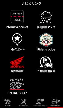 インターナビ技術を用いてスマートなルート設定が可能なインターナビポケットやお気に入りの場所を管理する「Myスポット」。ライダーにとって重要な雨雲の接近を知らせてくれる「カッパアラーム」、バイクライフに欠かせないHonda「販売店検索」、「二輪駐車場検索」、Honda純正洋用品の販売サイトへのリンクなど、楽しい連携機能を充実しています。