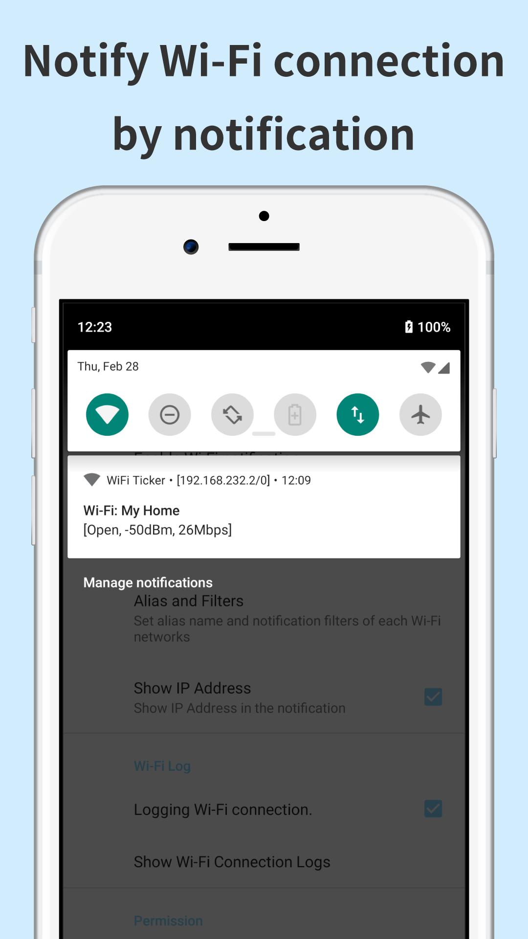 - Customizable notification tap action. You can select an action when tapping the notification. For example, you can execute an action such as opening Wi-Fi setting screen, displaying W-Fi connection log, launching an app, etc. by tapping a notification.