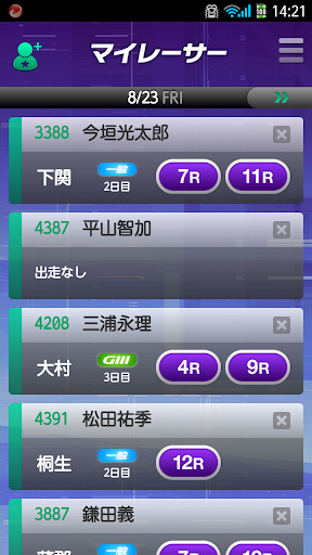 マイレーサーは、あらかじめ登録しておいた選手(最大15名)の出走表/結果にダイレクトにアクセスできる機能です。