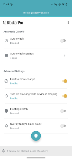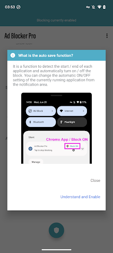 - Auto Switch: A feature to block ads only in specific apps. Automatically detects app launch/termination and toggles blocking on/off.
