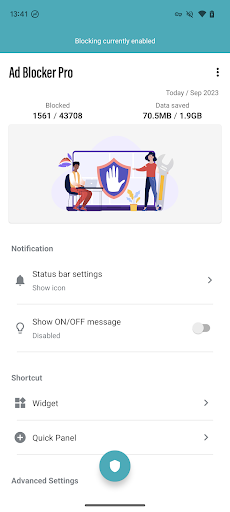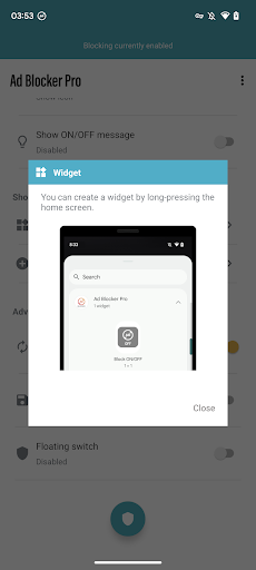 - One-tap ON/OFF switch: Easily toggle ad blocking on/off from the notification area, quick panel, widget, or floating switch.