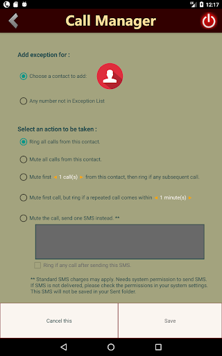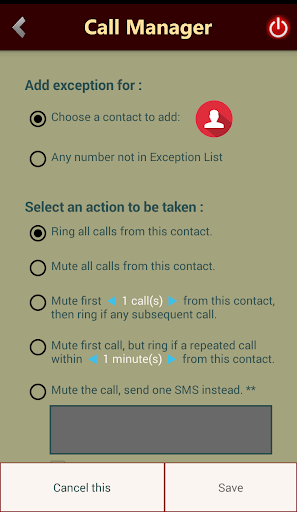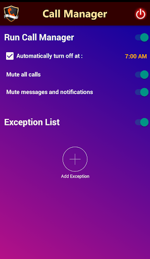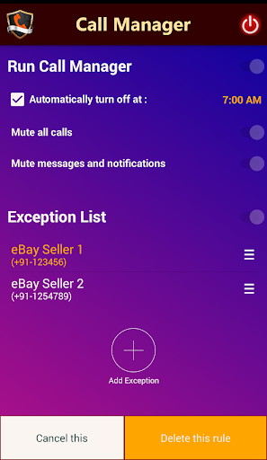 Do not get disturbed by unwanted calls anymore while sleeping. Call Manager helps you to manage your calls efficiently. All your calls will remain silent, but you can add some numbers in the Exception List. These numbers will be handled differently by Call Manager. You can add your parents' number, close friends or anyone you think important. You can also set various options how the app should handle any call from those numbers. Each number will be handled differently based on the options you have set. Now you can go to sleep without any worry. Do not miss an important or urgent call. Please check various options how the exceptions can be added. For example, you can add one number and instruct Call Manager to mute first 2 calls from that number. Call Manager will ring the call from that number third time onward. There are many different customization available for all such settings based on your specific need.