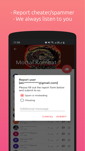 - We scan cheaters or spammers and block them everyday. If you see any user is cheating or spamming, please feel free to fill out the report form in the app and submit it to us. We will review your report and ban that user immediately if he is cheating or spamming.