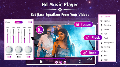 Sound enhancing tool such as Bass boost, Loudness, Virtulizer for applying varies sound effect while playing video on the Video Player HD - All Format for Android.