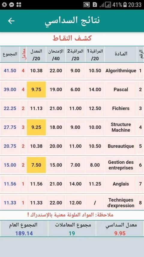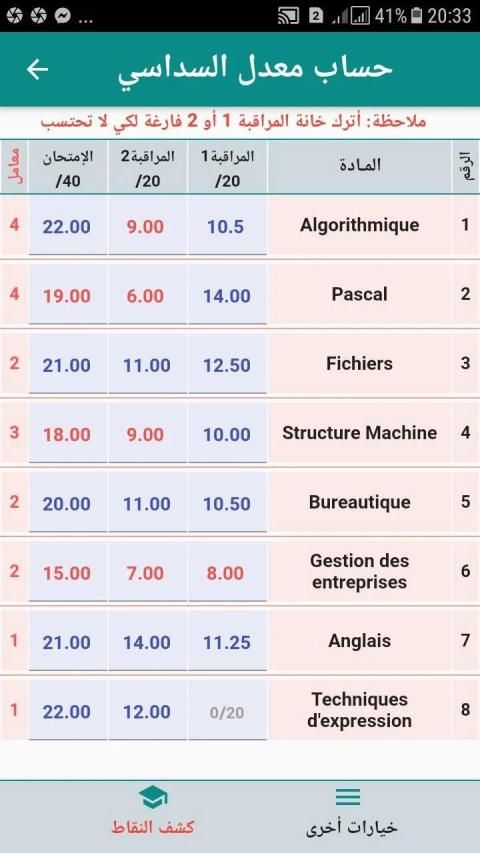 It is an application that calculates rates and displays results, works on all Android devices, and its goal is a pedagogy, it helps educators and professors education and vocational training in Algeria at the expense of rates and results for all disciplines and for all levels at the level of vocational training centers and vocational training institutes, and is characterized by ease and simplicity of use, and on Each user only inputs the taught materials, transactions, and exclusion points, then fills the stalker points (s) obtained in evaluations and exams during the hexagon.