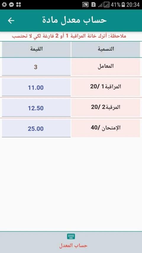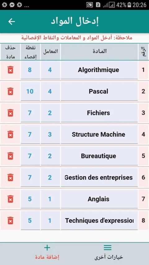 والتطبيق يمكنهم من إدراج المواد وحساب المعدلات والنتائج التالية: