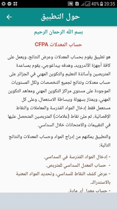 هو تطبيق يقوم بحساب المعدلات وعرض النتائج، ويعمل على كافة أجهزة الأندرويد، وهدفه بيداغوجي، يقوم بمساعدة المتربصين والأساتذة التعليم والتكوين المهني في الجزائر على حساب معدلات ونتائج لجميع التخصصات ولكل المستويات الموجودة على مستوى مراكز التكوين المهني ومعاهد التكوين المهني، ويمتاز بسهولة وببساطة الاستعمال، وعلى كل مستعمل فقط إدخال المواد المُدَرسة والمعاملات والنقاط الإقصائية، ثم ملئ نقاط (علامات) المتربصين المتحصل عليها في التقييمات والامتحانات خلال السداسي.
