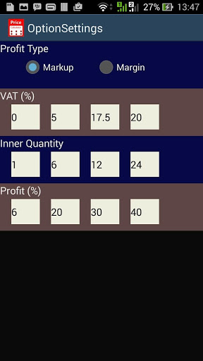 Selling Price Calculator, Calculates the price of the item for resale. VAT or GST can be added. Markup and Margin profit options available. Presetting of the VAT/GST, Profit and Inner quantity would save time, by avoiding repeated key inputs. Useful for small shop owners to calculate the final selling price of the product. Value Added Tax (Goods and Service Tax) can be included in the calculation.