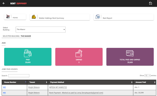 One can see from a dashboard how much has been collected and how much is pending. Late fees can also been automatically charged on a specific date, which encourages tenants to pay on time. Invoices and receipts are sent to tenants by SMS and email eliminating the cost of producing and distributing paper invoices and receipts.Money collected via MPESA goes to the property manager's paybill and is thus secure. The system can also be used by garbage collection companies to help them manage their customers and collect garbage fees via MPESA.