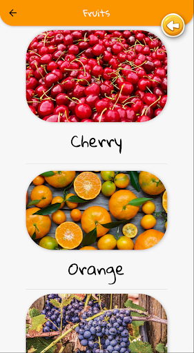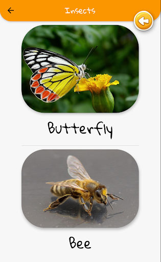 This app helps the kids to learn the various names and sounds of wild animals, domestic animals, fruits, vegetables, musical instruments, insects, body parts, action verbs, vehicles.