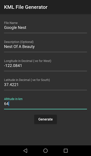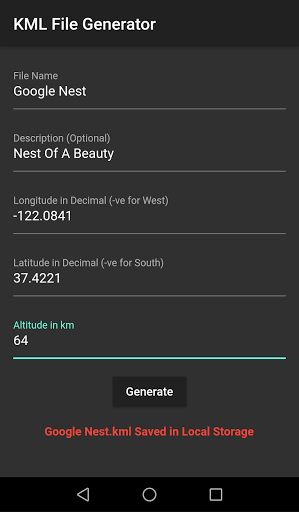 It generates the Key Hole Markup Placemark file based on the coordinates entered by the user. Very useful in geo-tagging by sharing the file that can directly be viewed on google earth.