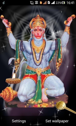 Lord Hanuman Live Wallpapers with amazing background effects with stars,Diya and Gada. -Change backgrounds from inbuilt 5 beautiful Hanuman wallpapers -Change number of stars. -Enjoy special effect with low memory consumption.