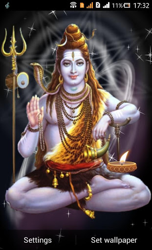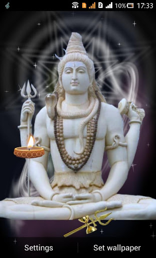 Lord Shiva Live Wallpapers with amazing background effects with stars,Diya and Trishul. -Change backgrounds from inbuilt 5 beautiful Shiva wallpapers -Change number of stars. -Enjoy special effect with low memory consumption.