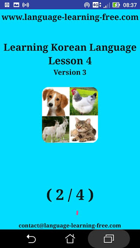 This is the fourth lesson from the serial of four lesson for learning Korean language , in this lesson you can learn the names of the animals in Korean language by sound , but you need to install (Google text to speech) for listening the sounds . There are 63 name in this lesson like the cow the horse , the donkey , the monkey and other fishes like the dolphin.