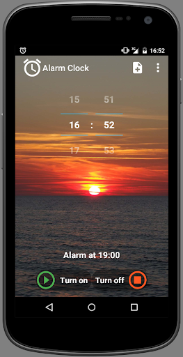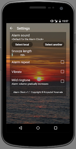 - settings: time alarm, alarm sound, alarm repeat, mild ringtone, snooze length, vibrate,