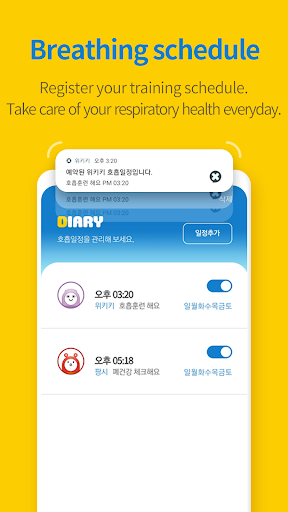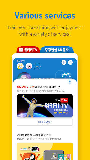 You can also meet penguin, bear, rabbit, and monkey friends that you saw in the Wikiki storybook in the Application. Children can choose, register and play their favorite characters, and they can enjoy blowing like characters in the story while it brings full amount of oxygen to their precious brain and body. In the play diary function, children can record the photos, feelings, and training of the day.