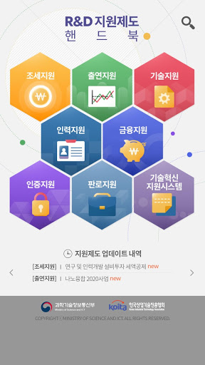 R&D 지원제도 핸드북은 기업의 기술혁신을 지원하기 위하여 정부와 공공기관의 기술개발 관련 지원제도 정보를 종합 제공하고자 조세, 출연, 기술, 인력, 금융, 인증, 판로 등 7개 분야에 대한 지원제도를 요약 정리하였습니다. 제공 : 과학기술정보통신부
