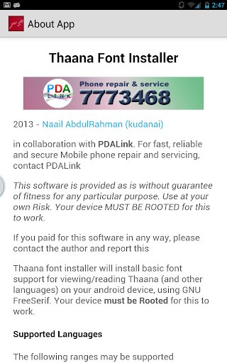 This is a simple utility that will install basic font support that will enable you to view and use Thaana* on your android device. (See screenshots for examples.