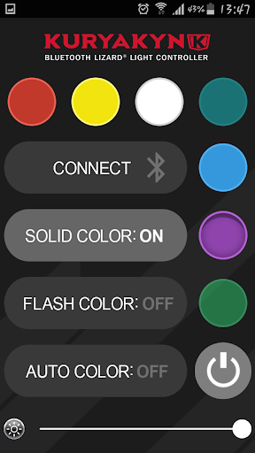 The Kuryakyn Lizard® Light app offers full control of the entire Lizard Light system. Cycle through and activate an array of colors from the convenience of your smartphone. The Bluetooth® Controlled Super Lizard Lights Kit includes a plug-&-play Bluetooth controller and everything needed to light up your ride directly from your smartphone.