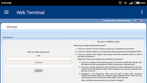 Application "Web Terminal KSTU" provides a convenient way to use the resources of the Karaganda State Technical University in its functions include the ability to view the schedule of classes and evaluation of students through a web interface. And more: