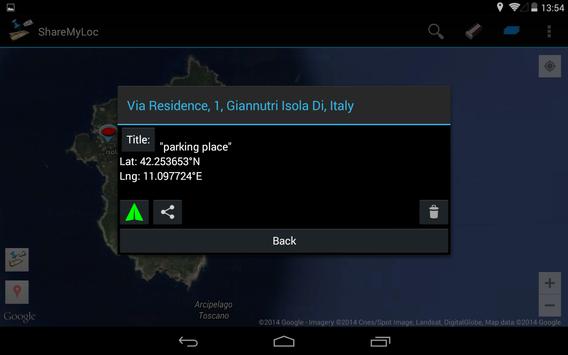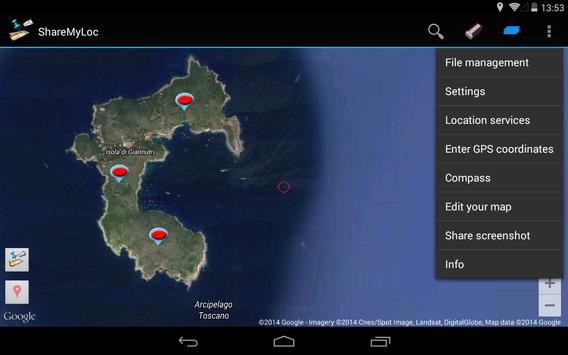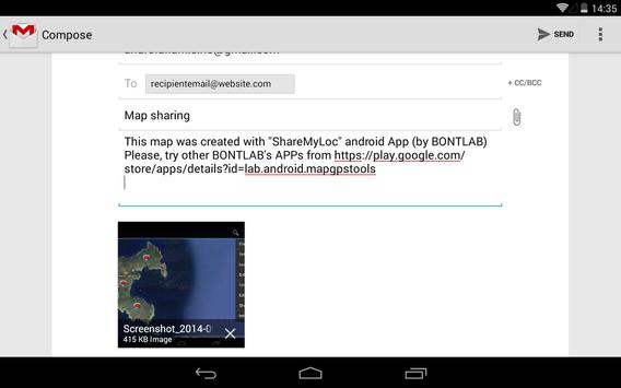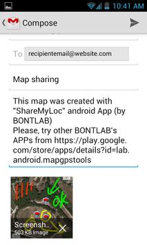 - The "Share screenshot" allows to share a portion of map (eventually personalized with "Map Editing" tool) by applications available on your device like EMAIL, bluetooth, WhatsApp etc..
