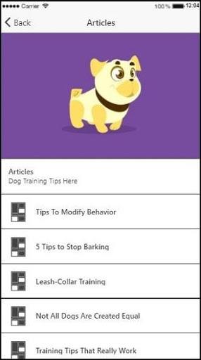 Once you install our app on your device, you will be able to find tips written by true professionals with real world experience. All the dog training techniques are practical and proven to work. Just some of the topics include best tips for house training a puppy as well as a unique dog training technique called therapy dog training. If training your dog or training your puppy is important to you, this app will be the perfect solution and your 'best friend'.
