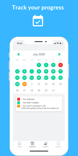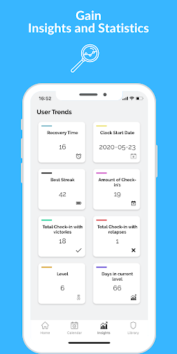 Track your progress and setbacks with Recovery Clock, Daily Check-in's, Calendar, Insights and Statistics and other amazing tools.