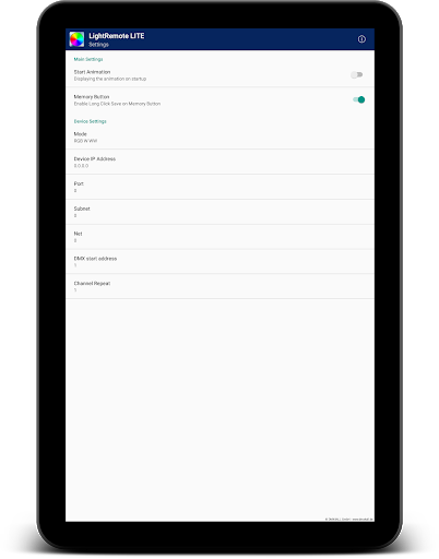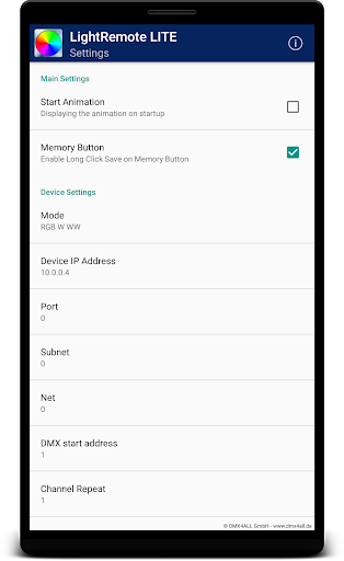The app "Light Remote LITE" for an easy controlling of Artnet / DMX installations integrates a user-friendly design, an attractive arranged surface with the possibilities of easy color Settings.