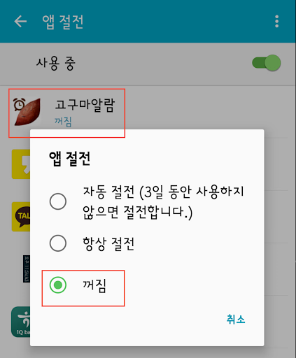 Settings-battery-battery saving mode (details)-Goguma alarm in the list