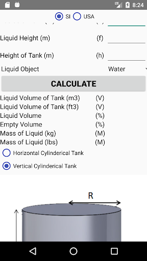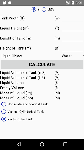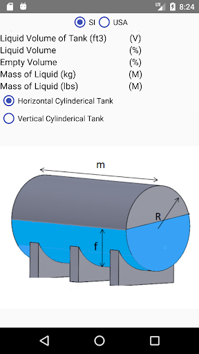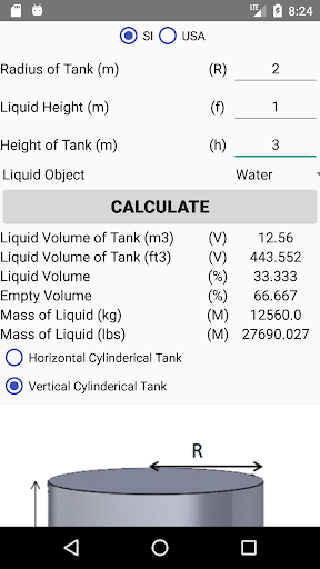 The application calculates the volume and weight of a liquid by its filling level, empty and total volume, and total mass