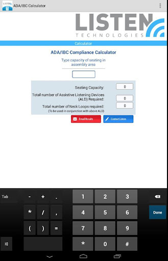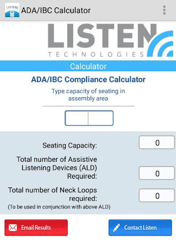 A simple-to-use calculator for the Americans with Disabilities Act: Assistive Listening Standards and International Building Code. The ADA Compliance Assistive Listening Calculator is a complete toolset for understanding and calculating your facility requirements to meet the 2010 ADA STANDARDS FOR ACCESSIBLE DESIGN. Complete with an easy-to-use calculator, email capability, helpful product and ADA links, product assistance and a quote request button. This application will take out the guess work for ADA requirements and make your work life easier. Listen Tech, Listen Technologies, ADA, ALD, Assistive Listening Device, Standards, Hearing Aid, Compliance, Calculator, ADACalculator, IBC, International Building Code.